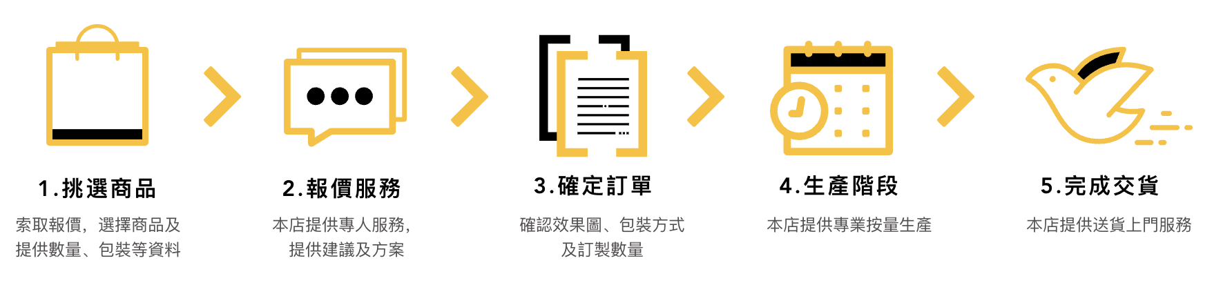 涵蓋設計、生產、包裝與本地配送,提供完整配套,助你輕鬆完成客製項目。